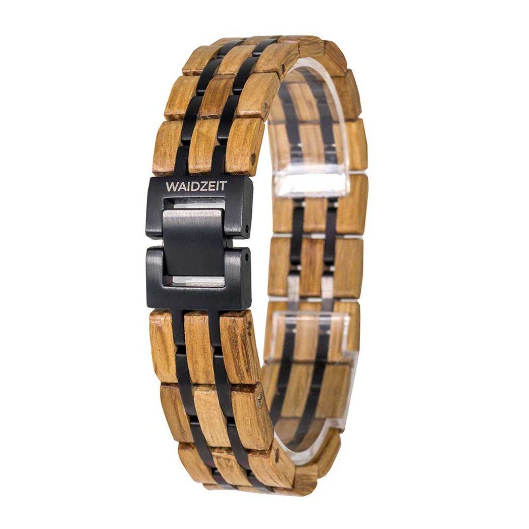 Přírodní barva pevného a odolného dřeva vypadá skvěle v kombinaci s tmavými kovovými detaily z chirurgické oceli. Masivní zapínání dodává celkovému vzhledu